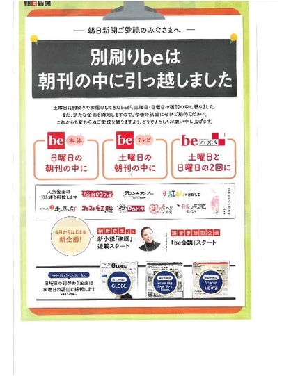 2026年04月04日(土) 休刊・休業 < お知らせ NEW Be お引越し 週末版Beがお引越し 別刷りBeは朝刊の中に引越しました。 土曜日に別刷りでお届けしていたBeが 土曜日・日曜日の朝刊の中に掲載されます。 よろしくお願いいたします。